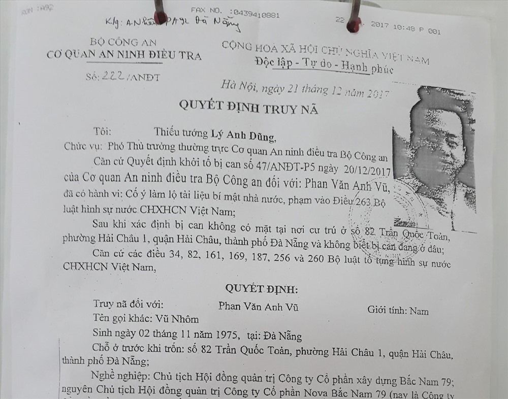 Trước đó, như báo Lao Động đã thông tin, quyết định truy nã này do Thiếu tướng Lý Anh Dũng - Phó Thủ trưởng thường trực Cơ quan An ninh điều tra Bộ Công an ký ngày 21.12.